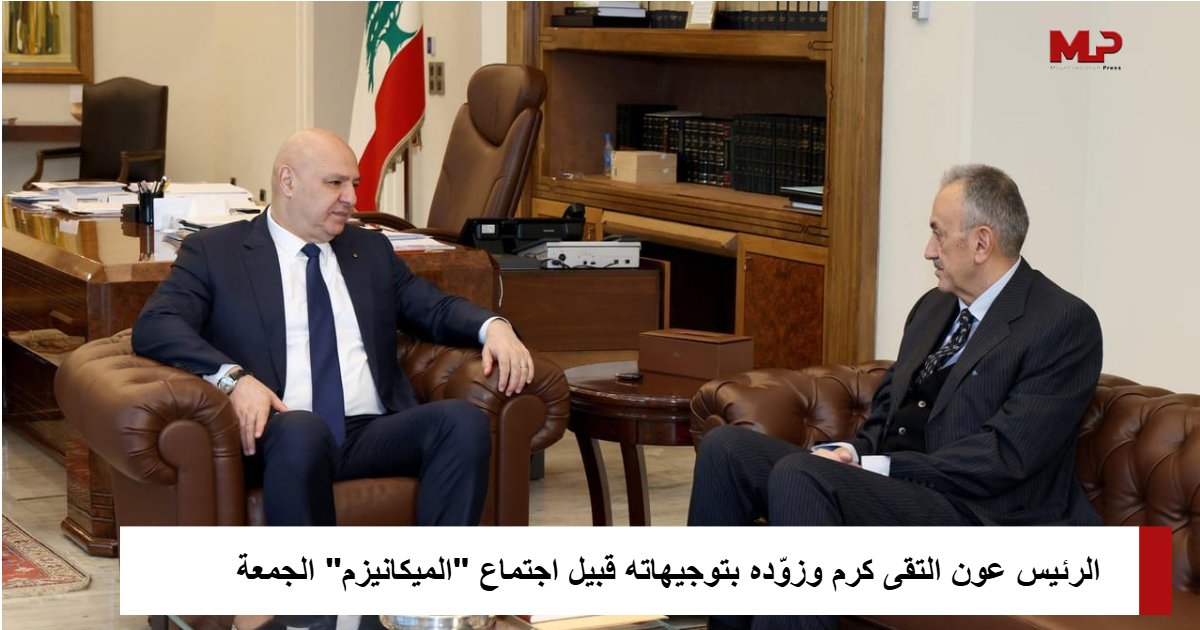 التقى رئيس الجمهورية العماد جوزاف عون رئيس الوفد المفاوض في “الميكانيزم” السفير السابق سيمون كرم، وزوده بتوجيهاته قبيل الاجتماع المقرر للجنة يوم الجمعة المقبل.