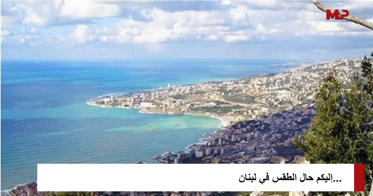 الأحد: الطقس غائم جزئياً مع احتمال لتساقط بعض الرذاذ المحلي فجرا. أما درجات الحرارة فتتراوح على الشكل التالي: بين ١٤ و٢٢ درجة ساحلا، بين ٤ و١٧ درجة بقاعاً، وبين ١٠ و ١٦ درجة على الـ١٠٠٠ متر، فيما الرياح شمالية غربية وسرعتها بين ١٠ و٤٠ كم/س.