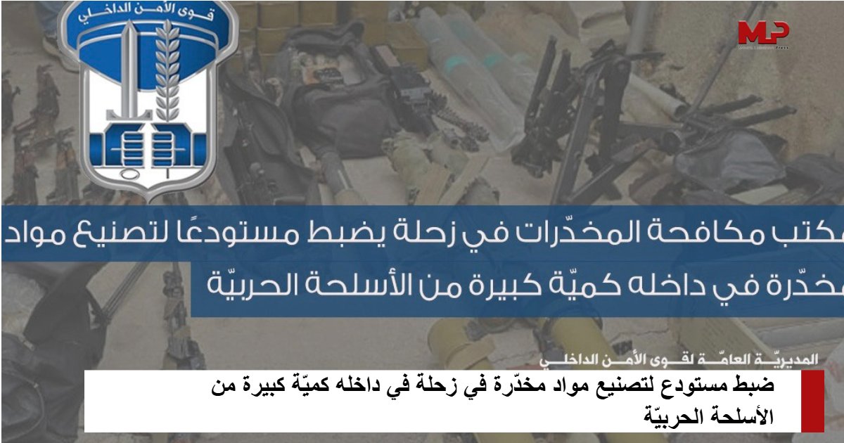 صدر عن المديريّة العامّة لقوى الأمن الدّاخلي – شعبة العلاقات العامّة البلاغ التّالي:”في سياق المتابعة المستمرّة التي تقوم بها قوى الأمن الدّاخلي لملاحقة المتورّطين بجرائم المخدّرات وتوقيفهم، وبناءً على معلومات توافرت لدى مكتب مكافحة المخدّرات المركزي في وحدة الشرطة القضائية حول وجود مستودع يُستخدم في تصنيع المخدّرات والمواد المخدّرة، إضافةً إلى تخزين أسلحة حربية، في منطقة البقاع – محلة كفردان