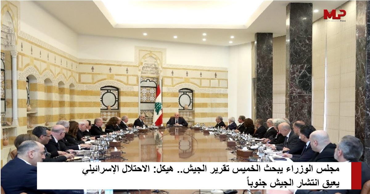 جلسة مجلس الوزراء الخميس المقبل يخصّص جزءٌ أساسي منها لعرض التقرير الرابع والأخير المتعلّق بالمرحلة الأولى من خطة حصر السلاح في منطقة جنوب الليطاني، والذي سيقدّمه قائد الجيش العماد رودولف هيكل.