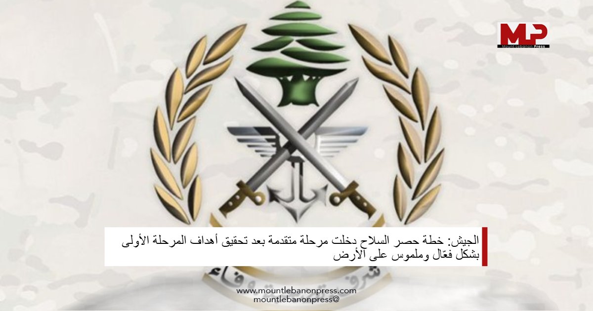 وفي هذا الإطار، أكد الجيش أنّ خطته لحصر السلاح قد دخلت مرحلة متقدمة، بعد تحقيق أهداف المرحلة الأولى بشكل فعّال وملموس على الأرض. وقد ركّزت هذه المرحلة على توسيع الحضور العملاني للجيش، وتأمين المناطق الحيوية، وبسط السيطرة العملانية على الأراضي التي أصبحت تحت سلطته في قطاع جنوب الليطاني، باستثناء الأراضي والمواقع التي لا تزال خاضعة للاحتلال الإسرائيلي.