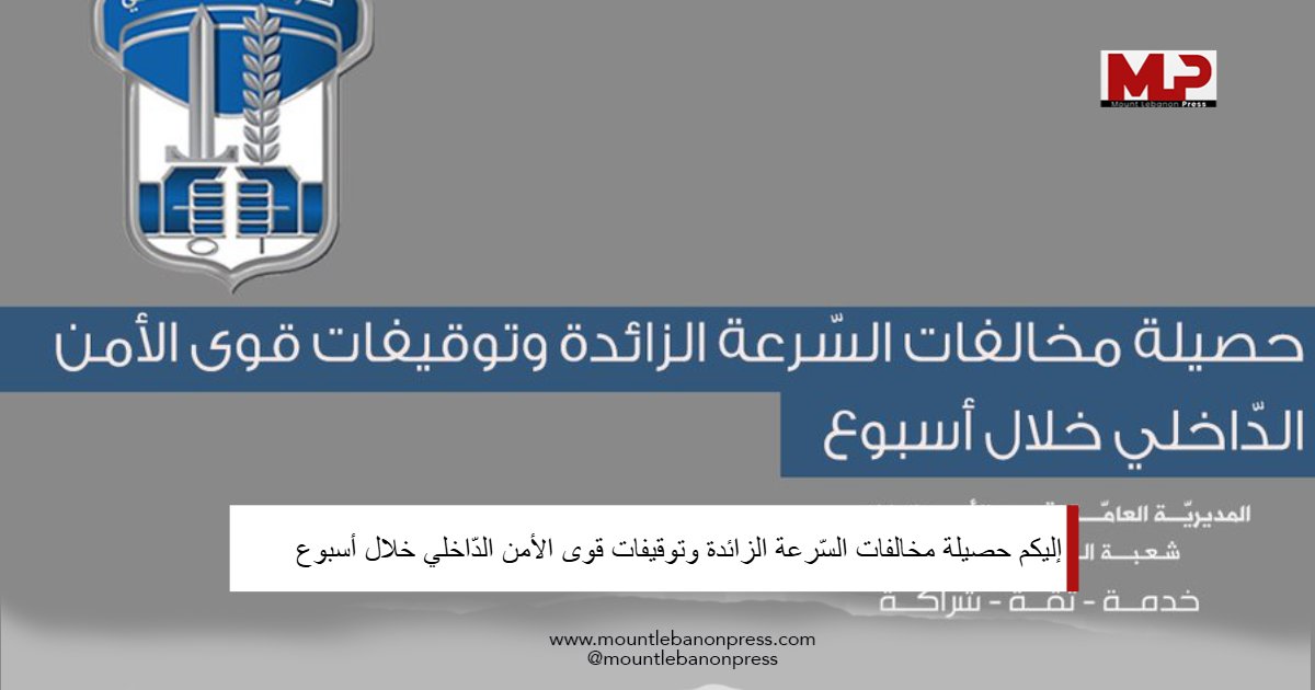 تواصل مفارز السّير في قوى الأمن الدّاخلي مهمّة ضبط مخالفات السّرعة الزائدة عبر الرّادارات ليلاً نهاراً، والتي سجّلت خلال أسبوع، اعتباراً من 5-1-2026 لغاية صباح 12-1-2026، تنظيم 4286 مخالفة سرعة زائدة، وذلك بهدف الحفاظ على سلامة المواطنين وتشكيل رادع لدى السّائقين للقيادة بتأنٍ، والحدّ من الحوادث.