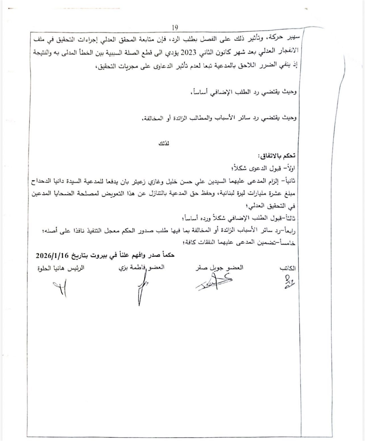 صدر حكم قضائي عن محكمة بداية بيروت قضى بإلزام الوزيرين علي حسن خليل وغازي زعيتر بدفع تعويض قدره عشرة مليارات ليرة لبنانية للتعسف باستعمال حق الادعاء والدفاع وتسويف قضية المرفأ لطلبات رد المحقق العدلي ورد القضاة الناظرين بطلبات الرد المقدمة منهما لشل عمل القضاء وعدم اصدار الاحكام في القضية.