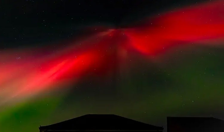 ويعود ذلك إلى تأثير أقوى عاصفة إشعاع شمسي من الفئة S4 منذ أكثر من 20 عاماً، والتي تتعرض لها الأرض. وقد رُصد هذا الشفق الأحمر الساطع بشكل غير معتاد في الولايات المتحدة والمملكة المتحدة، وحتى في شمال إيطاليا في أوروبا، بل وحتى في الصين.