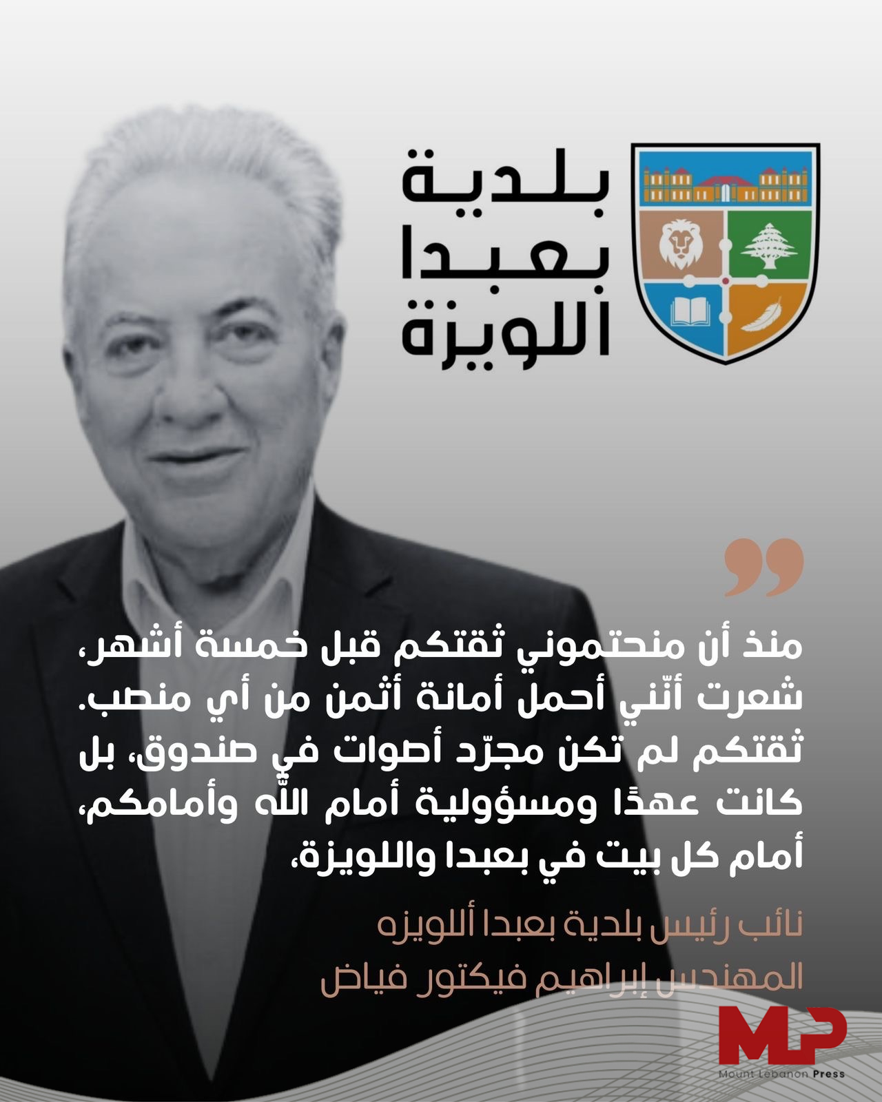 منذ أن منحتموني ثقتكم قبل خمسة أشهر، شعرت أنّني أحمل أمانة أثمن من أي منصب. ثقتكم لم تكن مجرّد أصوات في صندوق، بل كانت عهدًا ومسؤولية أمام الله وأمامكم، أمام كل بيت في بعبدا واللويزة، أمام شبابنا الذين يحلمون ببلدة أفضل، وأمام كبارنا الذين تعبوا وأعطوا الكثير. يومها حللتُ أوّلًا في الترتيب، ثم انتخبني زملائي نائبًا للرئيس، فأدركت أنّ واجبي أكبر من أي لقب أو موقع.