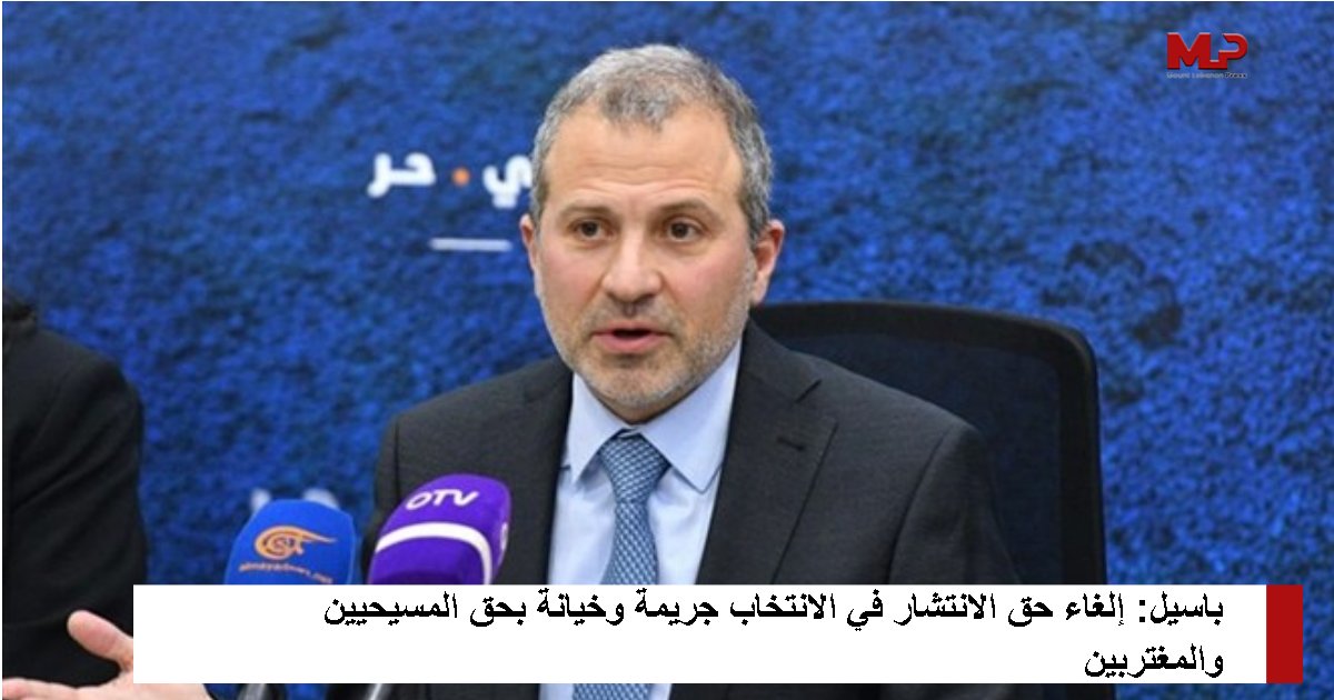 وأضاف باسيل: “إلغاء حق المنتشرين اسمه تواطؤ، واسمه التسوية الفضيحة، الجريمة والخيانة بحق الانتشار والمسيحيين، وهذا تكرار لمسار من عام 1990 إلى اليوم، تمامًا كما حصل بتطيير القانون الأرثوذكسي”.