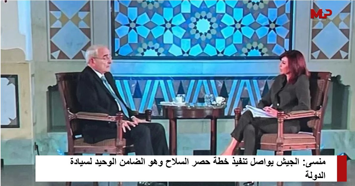أما في ملف السلاح داخل المخيمات الفلسطينية، فأعلن أن” 5 مخيمات تم نزع سلاحها الثقيل والمتوسط، والعمل جار لاستكمال العملية في باقي المخيمات، تنفيذا لقرار مجلس الوزراء بحصر السلاح بيد الدولة اللبنانية”.
