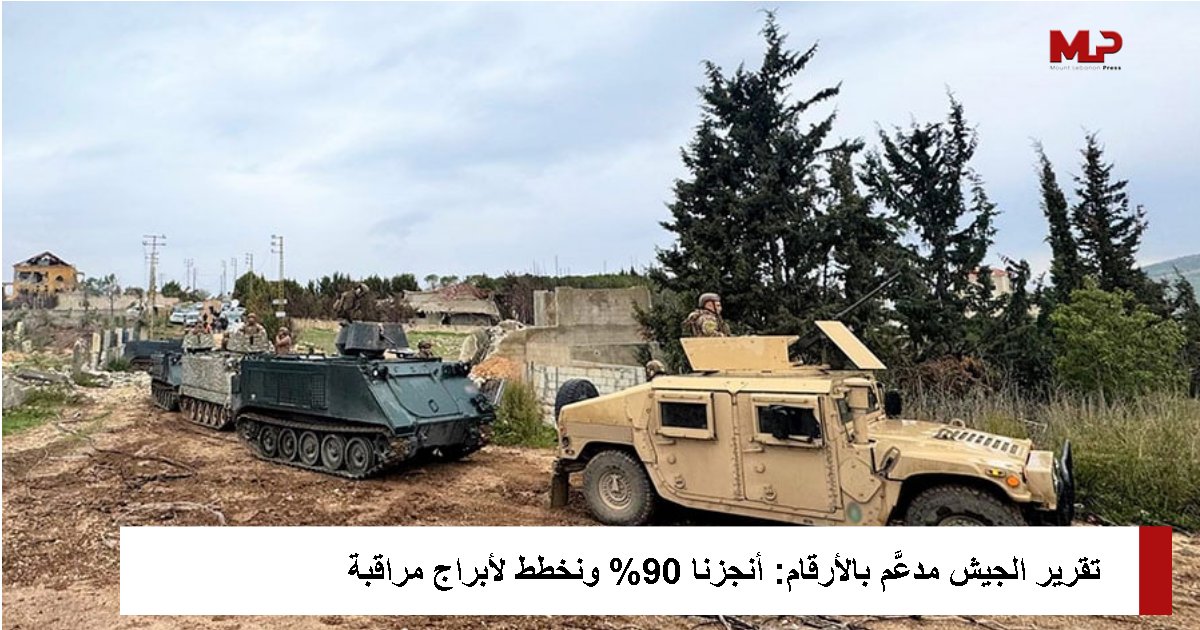 ويُلفت المصدر العسكري إلى أنّ الجيش أنجز 90 في المئة من مهمته هناك؛ والمتبقّي يعتمد بالدرجة الأولى على انسحاب الاحتلال ووقف الاعتداءات، وبدرجة أدنى على توفر المعدات. ومن الطبيعي أن تتضمن محاور تقرير قائد الجيش معلومات حول إقفال الأنفاق وتعزيز الانتشار في المنطقة الحدودية.