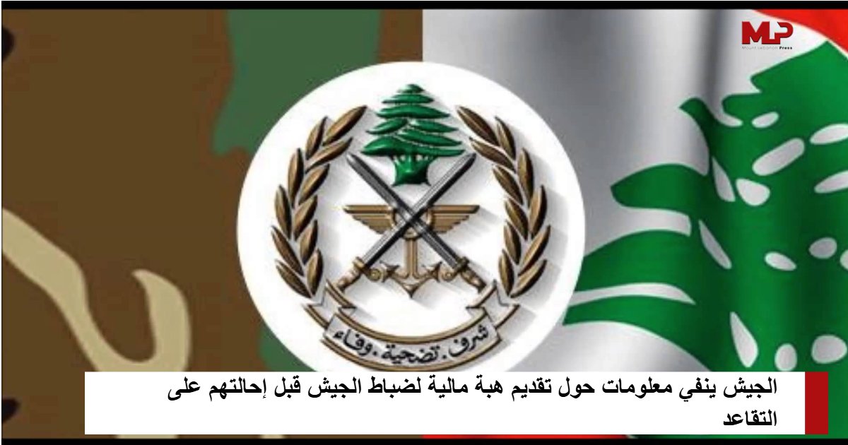 أعلنت قيادة الجيش في بيان ان “بعض المواقع الإلكترونية ووسائل التواصل الاجتماعي يتداول معلومات حول تقديم هبة مالية من إحدى الدول العربية إلى ضباط الجيش قبل إحالتهم على التقاعد. تنفي قيادة الجيش هذه المعلومات نفيًا قاطعًا وتؤكد ضرورة التحلي بالمسؤولية، وتوخي الدقة في نشر أي خبر عن المؤسسة العسكرية، والعودة إلى بياناتها للحصول على المعلومات الدقيقة”.