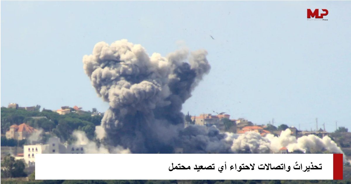 توالت التحذيرات من غير مصدر خارجي من انحدار الأمور إلى مخاطر كبرى، فيما أعلنت الخارجية الفرنسية أنّ الضربة الإسرائيلية على الضاحية تُعزِّز مخاطر التصعيد في المنطقة». ويُنقل في هذا المجال عن سفير دولة أوروبية كبرى، تخوّفه البالغ من التصعيد، وخصوصاً أنّ الوضع على جبهة لبنان، بلغ من الهشاشة حداً قابلاً للتدهور بصورة شديدة الخطورة.