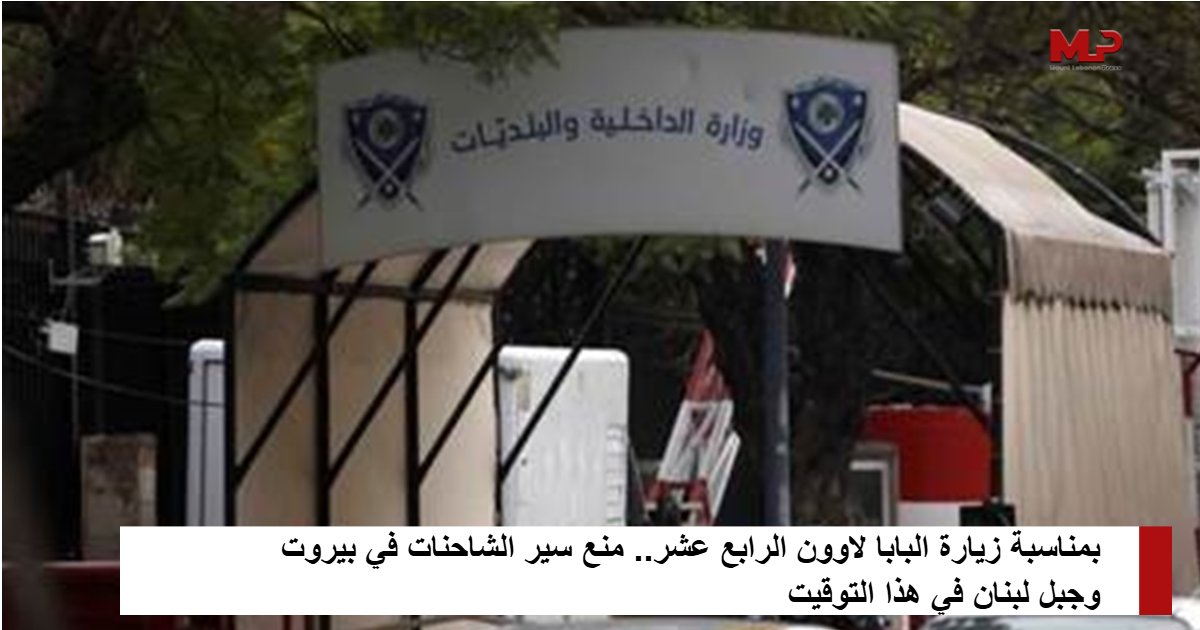 أصدرت وزارة الداخلية والبلديات قرارا بمنع سير الشاحنات في محافظتي بيروت وجبل لبنان اعتباراً من الساعة 8:30 صباح يوم الأحد في 30/11/2025 ولغاية الساعة 21:30 من يوم الثلاثاء في 2/12/2025، وذلك بمناسبة زيارة البابا لاوون الرابع عشر.