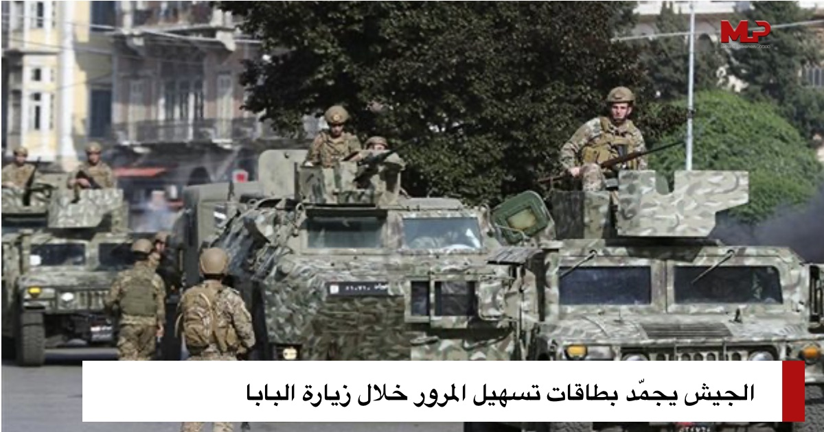 أعلنت قيادة الجيش – مديرية التوجيه، أنه اعتبارًا من 29/تشرين الثاني/2025 ولغاية 3/كانون الأول/2025، يُجمَّد مفعول بطاقات تسهيل المرور الصادرة عن قيادة الجيش في محافظتَي بيروت وجبل لبنان، وذلك بمناسبة زيارة قداسة البابا لاوون الرابع عشر إلى لبنان.