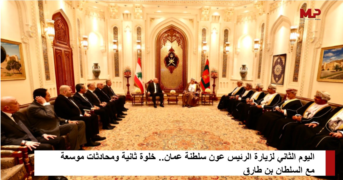 واصل رئيس الجمهورية العماد جوزاف عون زيارته لسلطنة عمان حيث عقد قبل ظهر اليوم خلوة مع السلطان هيثم بن طارق في قاعة المجلس في قصر العلم، اعقبها محادثات موسعة حضرها عن الجانب اللبناني وزراء:  الداخلية احمد الحجار،  الدفاع ميشال منسى، الخارجية يوسف رجي، الصحة ركان ناصرالدين والزراعة نزار هاني، سفير لبنان المرشح في سلطنة عمان السفير مجدي رمضان، والمستشار الشخصي لرئيس الجمهورية  العميد اندريه رحال.